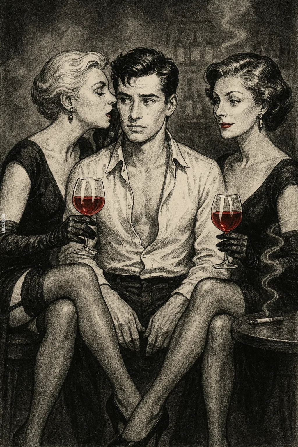 Catherine zsunęła szpilki, podciągnęła sukienkę lekko nad kolana i przysunęła się bliżej. Elise sięgnęła po butelkę wina i nalała im po odrobinie. Mateusz napił się i spojrzał na obie kobiety – były jak dwie różne opowieści splecione w jedną. Catherine – zdecydowana, z nutą dominacji w spojrzeniu. Elise – delikatna, miękka, subtelna jak francuska piosenka z lat 50.